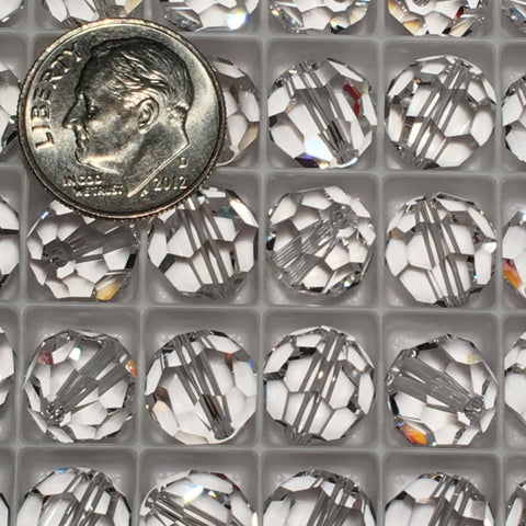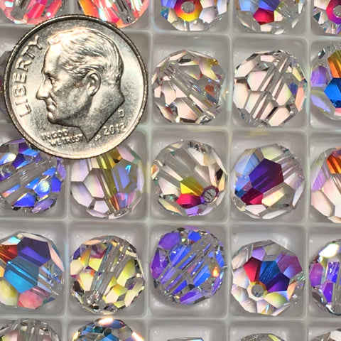 Round faceted bead with a hole through the center. Available in both clear and aurora borealis. For another option, you might want to try Asfour's version of the crystal bead, 3000 10mm.